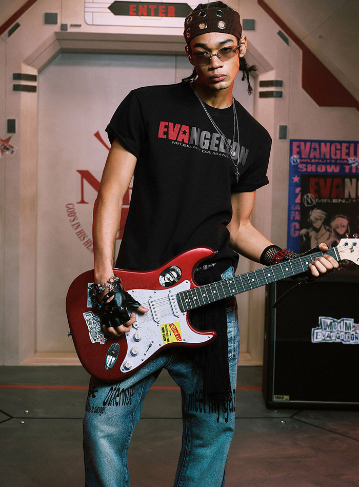 正面采用 “EVANGELION” 与 “MEDM” 的组合字母印花,部分款式加入 “MR.ENJOY DA MONEY” 的品牌全称,通过粗体字体与撞色设计,凸显街头潮流的张扬感。