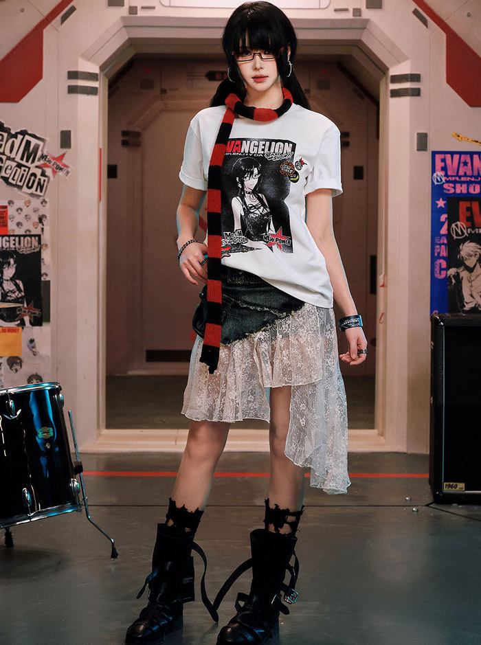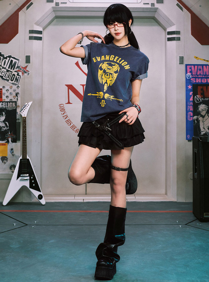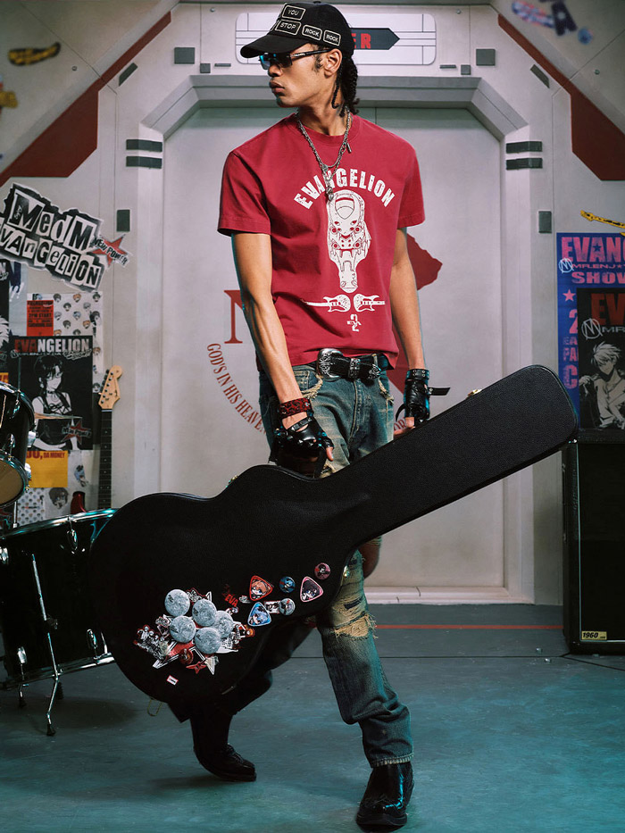 机体符号款:将初号机、2 号机的标志性轮廓与吉他图案结合,如深蓝色 T 恤上的初号机头部印花搭配双吉他图案,既保留机甲的机械感,又增添了音乐的动感。