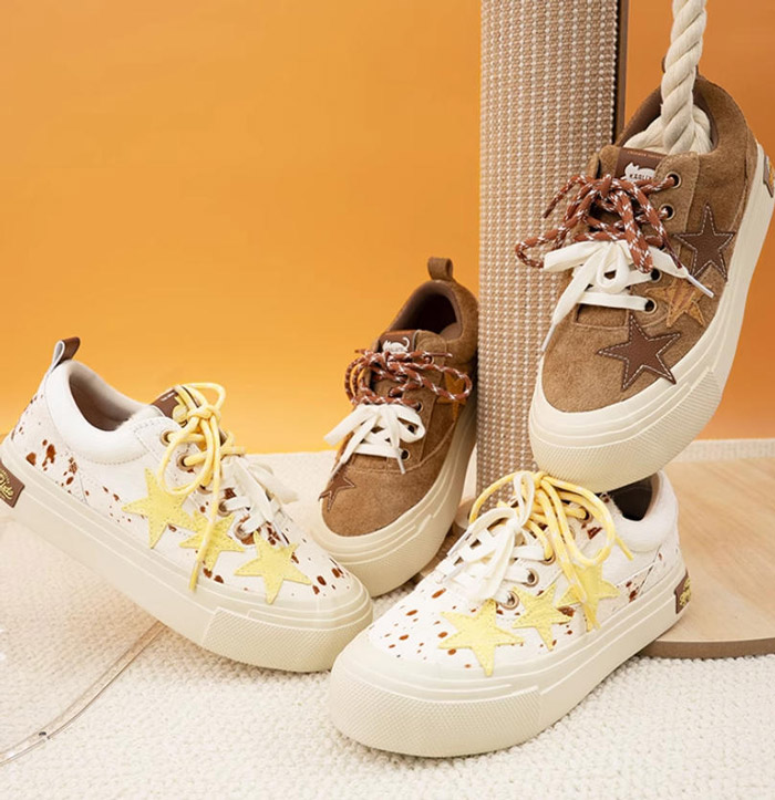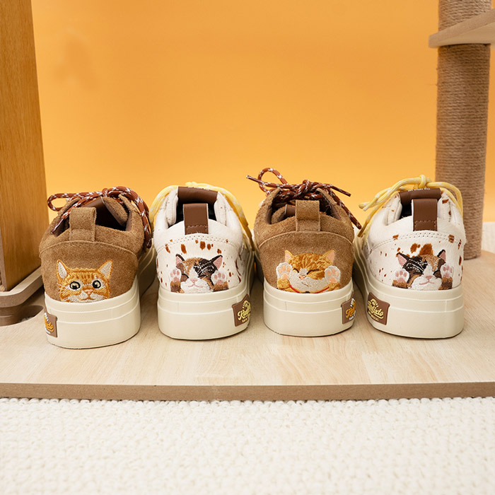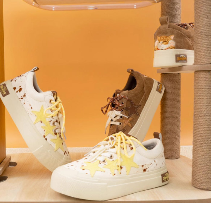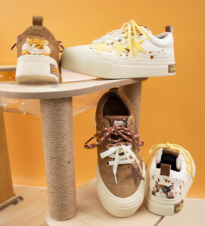 此次猫猫款星星帆布鞋,精准抓住了 “猫奴” 群体对萌系元素的偏爱,推出棕色橘猫、米白色斑点猫两大主题配色,每一款都藏着对猫咪形象的细腻还原。