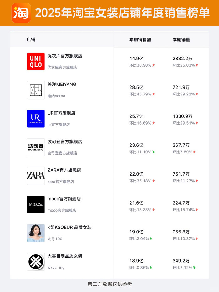 紧随其后的美洋 MEIYANG表现尤为亮眼,28.5 亿销售额搭配 45.79% 的环比飙升,721.9 万销量同步上涨 39.22%,凭借独特的设计语言与精准的风格定位,成为新锐女装品牌中的领军者。UR 官方旗舰店则以 25.7 亿销售额位列第三,16.69% 的稳步增长与 1330.9 万的高销量,印证了快时尚品牌在潮流迭代中的强大适应力。