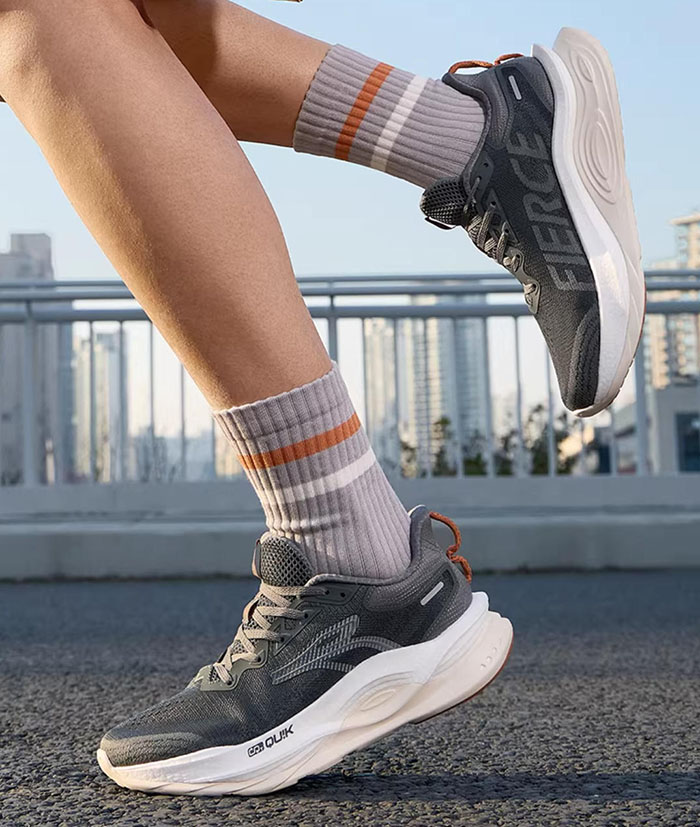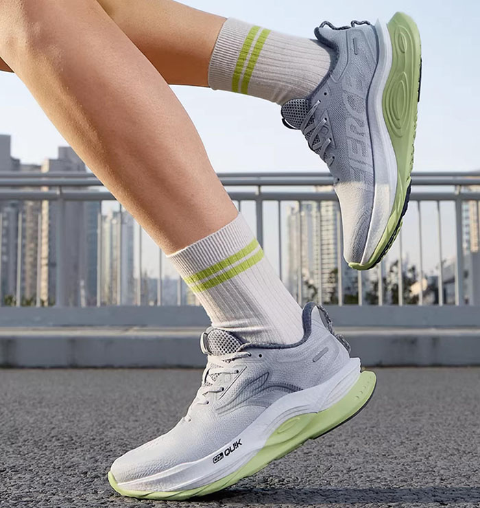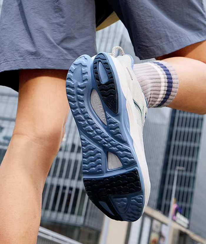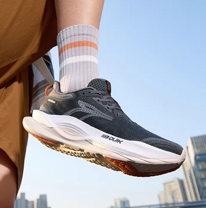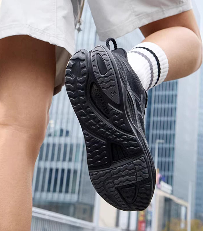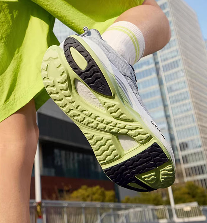 中底科技,向来是跑鞋的核心竞争力,赤焰5.0的双密度中底设计,相比上一代,中底厚度直接提升10%,上层超临界材质的占比也进一步加大,脚感的柔软度和澎弹感再上一个台阶。上层采用 QUIKCOT 脂肪族珠粒发泡材质,能实现 85%+ 的能量反馈,每一次落地都能感受到清晰的回弹助力,让慢跑时的抬脚更省力,完全没有百元跑鞋常见的 “踩实感”;下层则搭配轻质可触地 EVA,稳稳扛起支撑与抓地的重任,让缓震、回弹、稳定三大核心性能实现均衡在线。更值得一提的是,鞋款优化了外侧物理形变几何,同时进一步强化内外侧的不对称设计,中腰内侧大幅加高且做了加宽处理,不仅精准强化了中后掌内侧的支撑属性,有效减少初跑者跑步时的内翻问题,更让落地的稳定性大幅提升。
