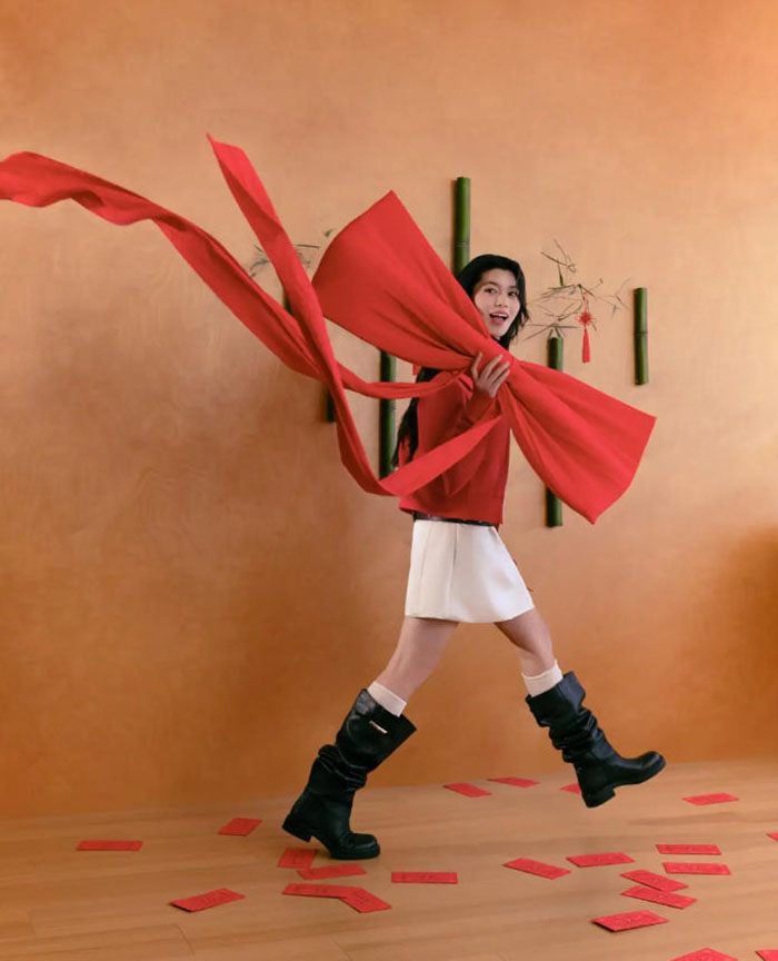 MAX&Co. 2026马年新春限定系列的设计巧思,更藏在对 “掌控感” 的极致追求中。立体剪裁在宽松廓形里暗藏筋骨,拒绝臃肿束缚,让穿着者在舒适自在中依旧气场在线;不同形态的幸运绳结作为装饰,完全由穿着者自主搭配,赋予造型独一无二的个性表达;色彩上跳出传统正红的窠臼,以更具现代感的深绛红碰撞鎏金,既有新春的喜庆氛围,又不失高级质感,轻松适配节日聚会与日常通勤的多元需求。