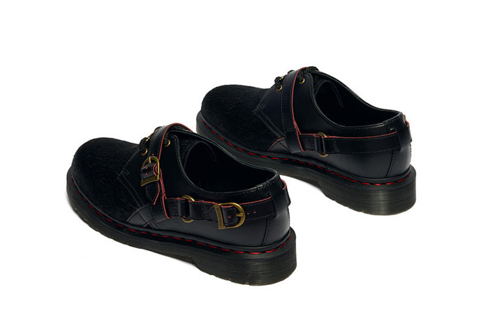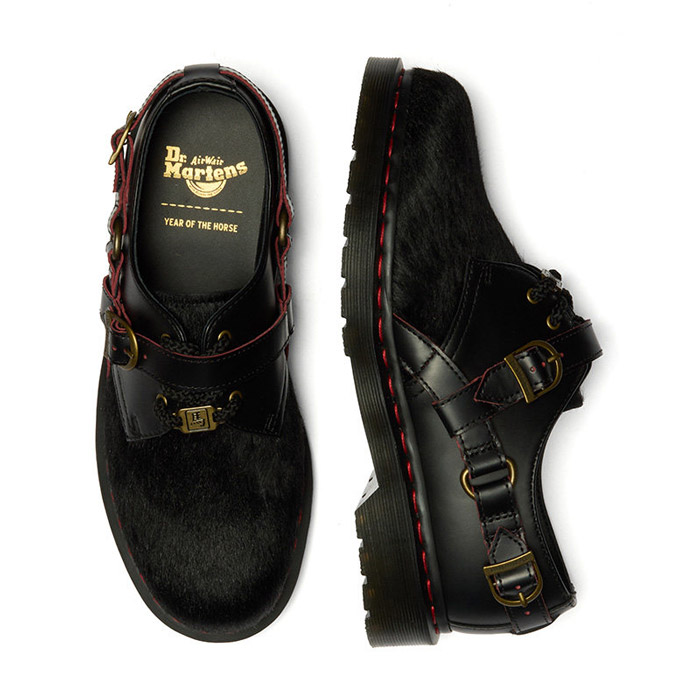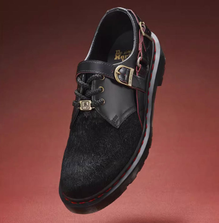 作为 Dr.Martens 标志性鞋款,3孔1461在马年限定系列中迎来惊艳重塑。品牌以「致敬马年」为核心灵感,将东方美学与朋克精神进行大胆碰撞与精妙融合。鞋面采用极具巧思的材质拼接工艺:鞋头甄选蓬松细腻的黑色马毛,每一根绒毛都泛着低调而高级的光泽,触感软乎乎却暗藏街头野性;鞋身则搭配质感出众的黑色 SMOOTH 亮面皮革,利落裁片贴合脚踝,油润光泽赋予鞋履挺括轮廓,尽显高级质感。更令人眼前一亮的是撞色红边缝线设计,细密针脚沿着鞋帮蜿蜒延伸,为酷帅基调注入一抹跳脱鲜活的亮色,成为整双鞋的视觉点睛之笔。