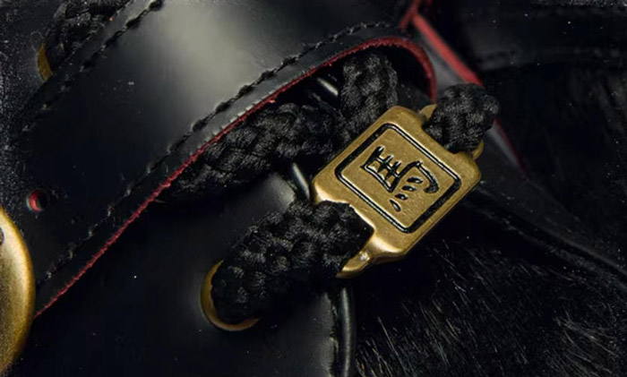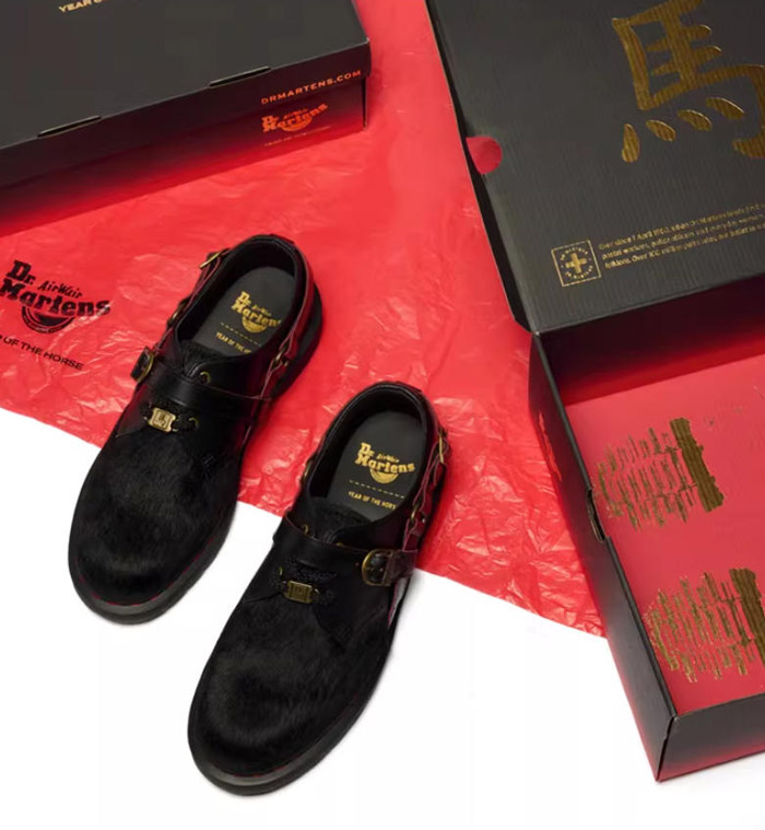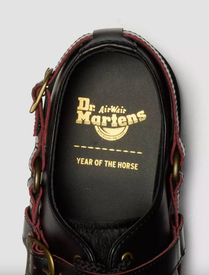 细节之处,更见限定款的匠心与诚意。鞋带扣采用黄铜质感的「马」字金属牌,复古做旧的色泽沉淀着浓厚东方韵味,低头间便能邂逅藏在酷感中的温柔巧思;鞋侧搭载马具缰绳灵感金属搭扣,扣身清晰压印「Dr.Martens」品牌标识,金属与皮革的碰撞,让朋克叛逆与工艺精致完美交融;鞋舌内侧烫印的「YEAR OF THE HORSE」字样,以及鞋垫上的同款标识,每一处细节都在诉说限定身份,让每次穿鞋都成为一场充满仪式感的邂逅。