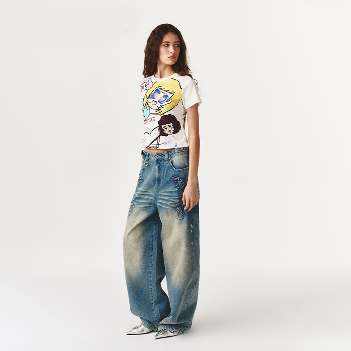 短款露腰漫画T恤:精准拿捏Y2K甜酷精髓,短款修身剪裁巧妙勾勒腰线,正面手绘黄发与棕发少女形象,蓝粉撞色眼眸与随性涂鸦线条充满俏皮元气,仿佛将少女的娇憨瞬间定格;背面则以简洁笔触呈现黄发与红发少女,层次干净利落。搭配做旧阔腿牛仔裤与银色尖头鞋,甜辣感瞬间拉满,是打造小个子显高比例的绝佳选择。