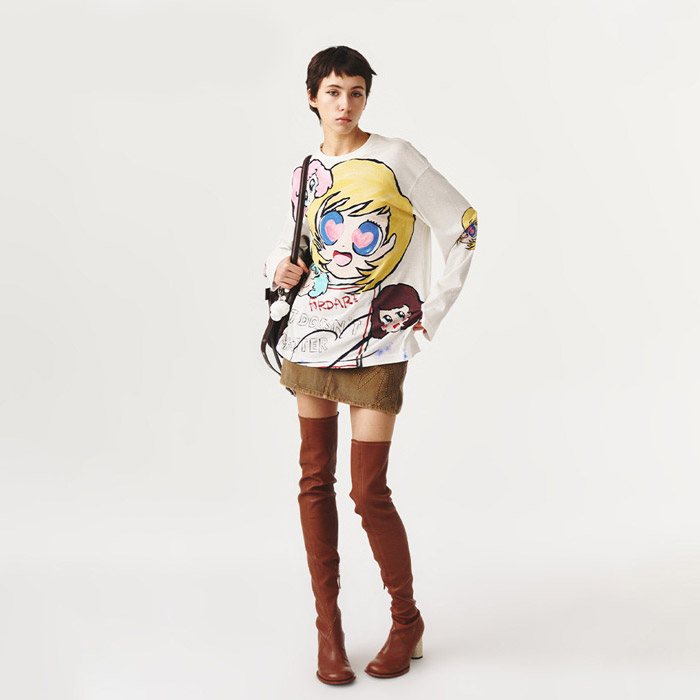 大尺寸涂鸦长袖T恤:oversized 版型自带慵懒随性质感,正面巨幅黄发爱心眼少女占据视觉中心,搭配棕发少女与手写 “FORDARI” 涂鸦,街头感与少女感完美平衡;背面集结黄发星星眼、粉发落泪感、棕发等多款漫画头像,视觉层次丰富又充满故事感。搭配麂皮短裙与过膝靴,甜辣交织,既能 hold 住日常通勤,也能成为音乐节、探店出片的个性战袍。