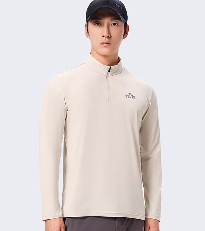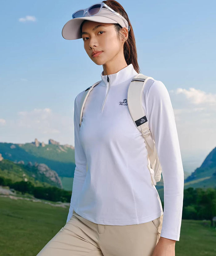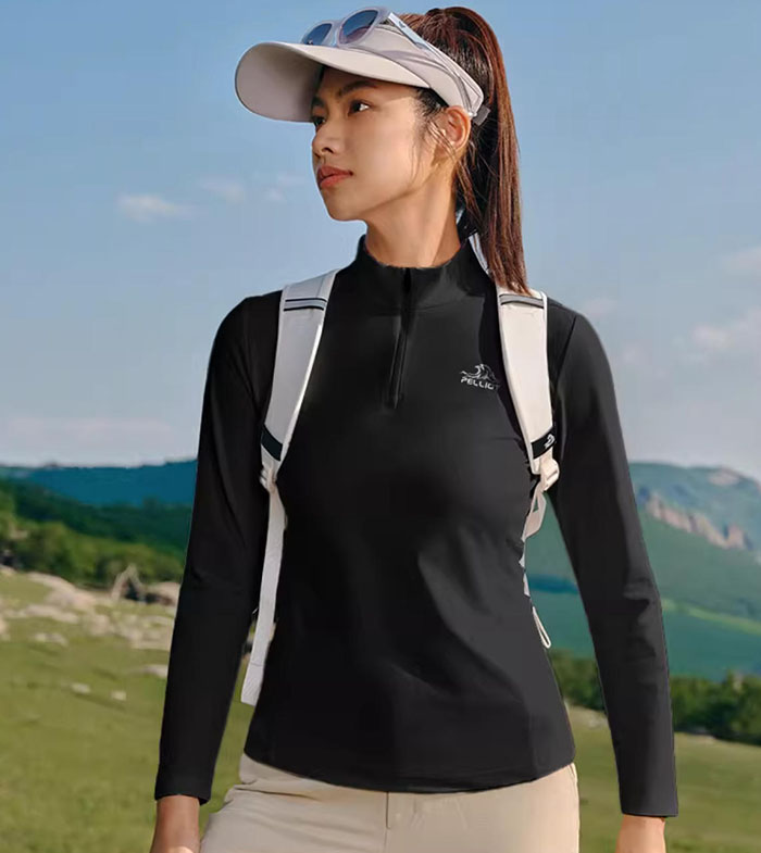 好的户外服饰,设计永远是功能性的第一载体。伯希和这款新款速干T恤,延续了品牌经典的户外设计语言,半拉链立领的造型利落又干练,彻底打破了传统户外 T 恤的刻板感。立领的设计并非单纯的造型修饰,而是实打实的户外刚需 —— 能有效阻挡山野间的微风,也能在日常出行中抵御阳光直晒颈部,实现基础的防风防晒效果。而可调节的半拉链则是设计中的巧思,拉合之间便能自由控制通风度,晨起跑步时的微凉可以拉上拉链做好防护,徒步途中身体发热时拉开拉链,瞬间实现空气流通,轻松应对户外多变的温度,也让一件T恤能适配不同时段、不同场景的穿着需求。更难得的是,其版型剪裁恰到好处,没有传统户外服饰的臃肿感,立领能自然修饰颈部线条,日常通勤单穿也毫无违和,功能性与时尚感在此处实现了完美平衡。