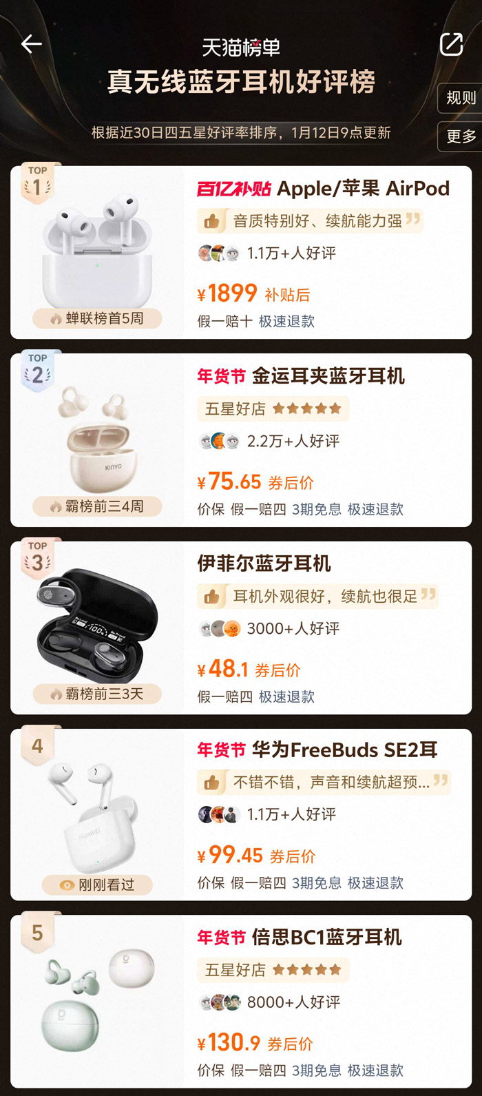 天猫榜单:2026真无线蓝牙耳机好评榜