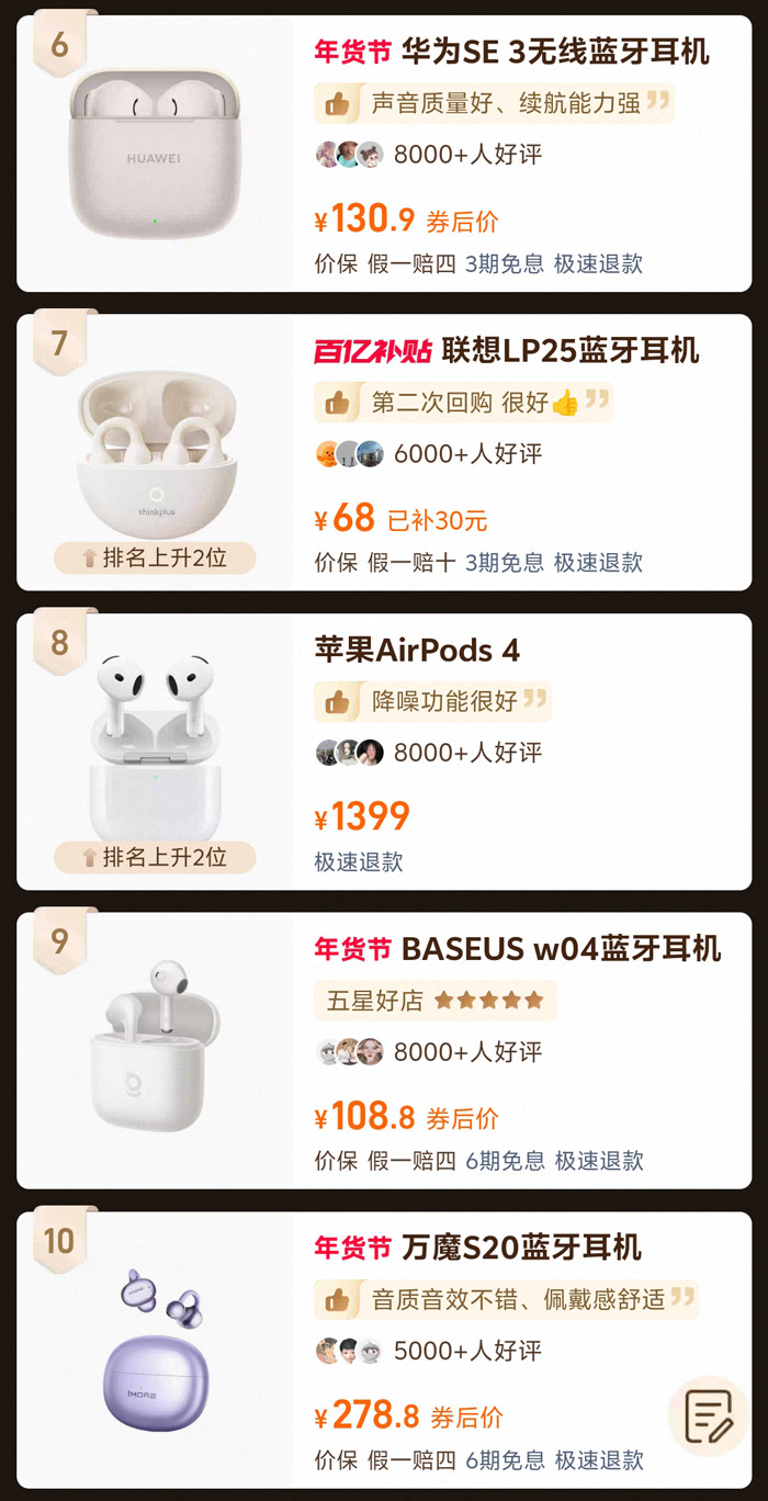 TOP8 Apple AirPods 4:1399 元参考价的 “旗舰入门款”,排名上升 2 位,近 30 天 8000 + 好评,简约设计搭配流畅生态体验,成为颜值党、苹果用户的心头好。