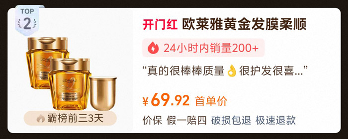 榜单第二、第三位则形成了大牌与国货双雄并立的格局,牢牢霸占前三席位的同时,各自凭借特色收获持续认可。L'OREAL 欧莱雅黄金发膜以 69.92 元首单价登场,霸榜前三三天,近 24 小时销量 200+,欧莱雅作为美妆大牌,其在护发领域的研发功底与品牌口碑,成为这款发膜的核心竞争力,满足了消费者对大牌品质护发的需求。