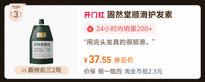 固然堂多肽角蛋白发膜则是国货护发中的佼佼者,37.55 元的券后价亲民又实惠,更实现了霸榜前三两周的好成绩,多肽角蛋白的核心护发成分直击发丝修护痛点,近 24 小时销量同样达到 200+,让国货护发的硬实力在榜单中尽显。