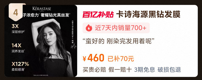 巴黎卡诗「海源黑钻」发膜位列第四,成为榜单中高端护发赛道的代表单品。这款发膜以 460 元百亿补贴价上榜,近 7 天销量 200+,在平价单品扎堆的榜单中,卡诗凭借奢级的护发体验与高端的成分配置,精准击中追求精致护发、愿意为高端护发买单的消费群体,也让这份榜单的产品层次更加丰富,展现出护发消费市场的多元化趋势。