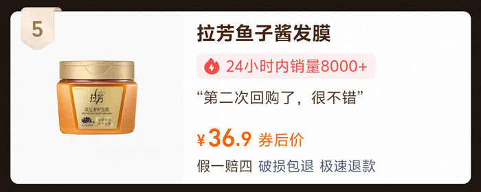 榜单第五位的拉芳黄金级鲟鱼子酱发膜,堪称本次榜单中的 “销量黑马”,成为最大的惊喜。36.9 元的券后价让其性价比拉满,近 24 小时销量更是狂飙至 8000+,这一数据远超榜单中其他单品,尽显国民度。作为国货老牌,拉芳始终深耕大众护发市场,此次将鲟鱼子酱这一高端护发成分融入产品,实现了高端成分与亲民价格的完美结合,也让这款发膜成为大众护发消费中的热门之选。