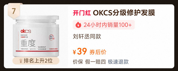 OKCS 分级修护发膜以 39 元券后价实现排名上升 2 位,近 24 小时销量 100+,分级修护的专业护发理念,让其在同质化的修护发膜中脱颖而出,为消费者提供了更具针对性的护发选择。