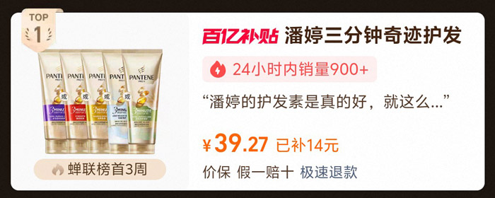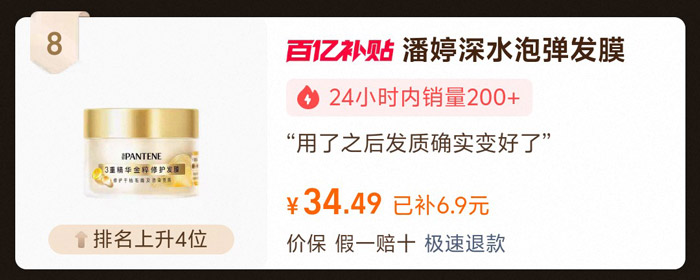 潘婷三明治发膜则是榜单中的 “上升先锋”,排名飙升 4 位,34.49 元的百亿补贴价性价比出众,近 24 小时销量 200+,这款单品的亮眼表现,再次印证了潘婷在护发领域的产品研发与市场布局能力。