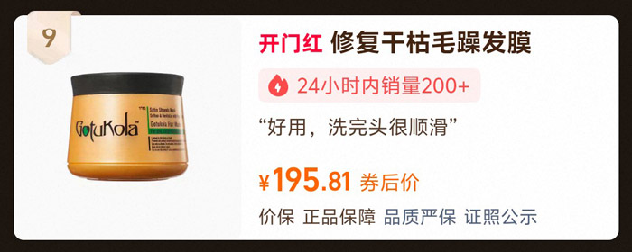 榜单第九、第十位则由 Gotukola 狗头发膜与邓为同款潘婷深水泡弹发膜占据,两款单品近 24 小时销量均为 200+,各有特色。Gotukola 狗头发膜券后价 195.81 元,凭借独特的护发配方与中高端的定位,在护发市场收获了一批忠实粉丝。