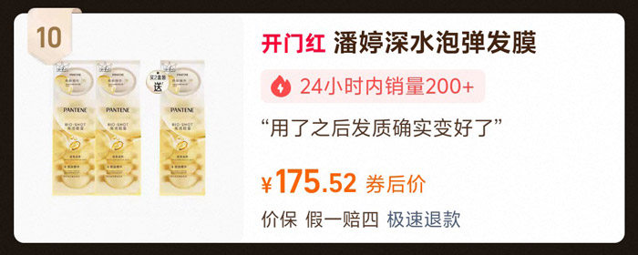 潘婷深水泡弹发膜则以 175.52 元券后价上榜,延续了明星同款的热度,与榜首的三分钟奇迹发膜形成双爆款格局,也让潘婷成为本次榜单中上榜单品最多的品牌,品牌在护发领域的深厚底蕴不言而喻。