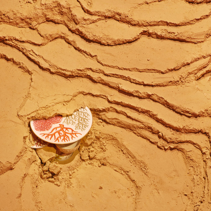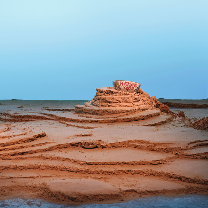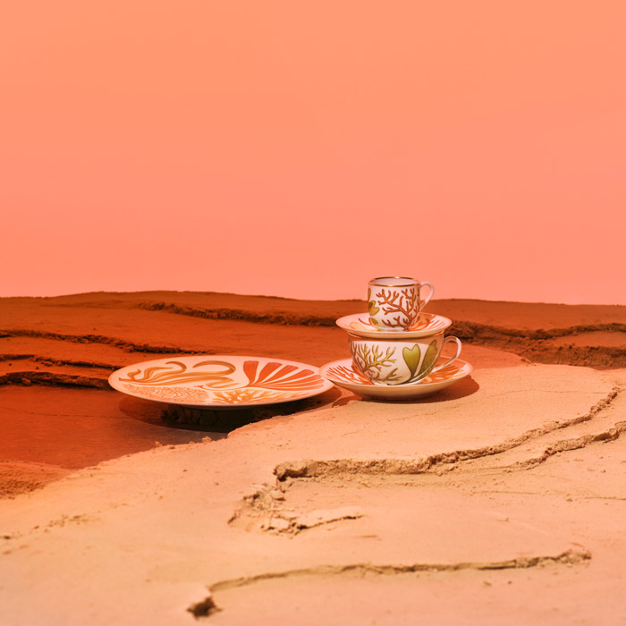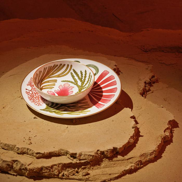 三十种灵动色调是这场海洋叙事的点睛之笔。清冽翠绿如潮汐初退的礁石苔痕,矿物米褐似海岸边沉淀的细沙,浓郁橘红像日出时浸染海面的霞光,还有瑰粉、青绿、沙色等色调交织,共同晕染出海洋的万千风情。百种植物形态在瓷面上舒展:裙带菜随波宛转,红藻摇曳生姿,素枈点缀其间,它们沿着餐盘、碗盏、沙拉碟与茶枕的起伏轮廓栖息,在水汽弥漫的想象空间里流转,构筑出一幅绮丽多姿的海底花园图景。