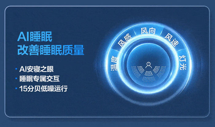 产品搭载AI 毫米波雷达(AI 安寝之眼),可实现睡眠专属交互,精准感知人体状态,智能动态调节温度、风速、风向与灯光,同时做到15 分贝低噪运行,从环境、交互、静音多维度出发,深度改善用户睡眠质量,为睡眠敏感人群打造静谧、舒适的睡眠环境。