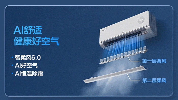 搭载智柔风 6.0 技术,通过双层柔风结构实现柔风不直吹,避免冷风直吹带来的不适;同时配备 AI 好空气、AI 好冷空气、AI 恒温除霜等功能,在精准控温的同时,优化室内空气环境,兼顾舒适与健康,满足全场景家居使用需求。
