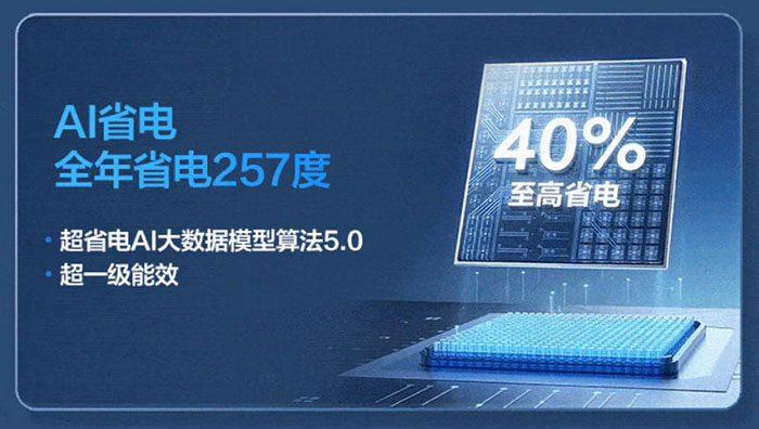 产品达到超一级能效标准,APF 值高达 5.3,搭载超省电 AI 大数据模型算法 5.0,可实现至高 40% 的省电效果,全年可省电 257 度,在保障极致舒适的同时,为用户大幅降低长期用电成本,真正做到 “舒适不费电”。