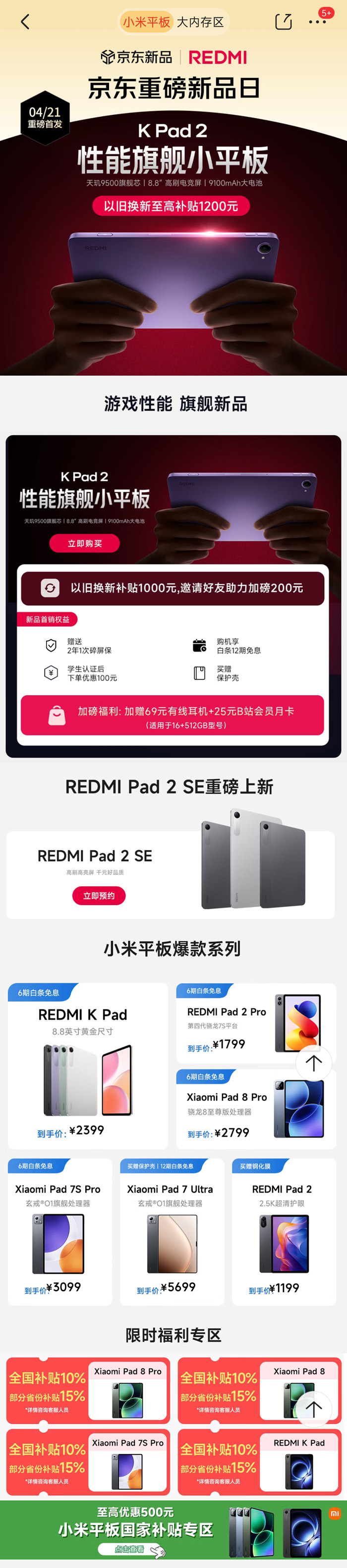 此外,限时福利专区同步开启,多款热门平板可享全国 10% 补贴,部分省份补贴至高 15%;小米平板国家补贴专区更有至高 500 元优惠,入手门槛再降低。