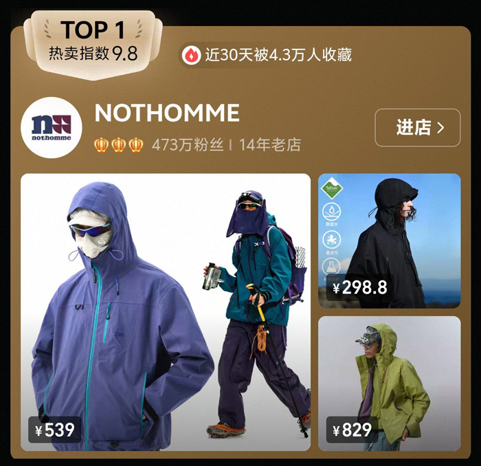 作为榜单断层式领先的头部品牌,NOTHOMME凭借14年的行业沉淀,早已成为国内山系男装的代名词。从榜单展示的产品来看,品牌主打专业级机能户外外套,价格带覆盖 298.8 元 - 829 元,其中一款售价539元的紫色连帽冲锋衣尤为吸睛,采用防水面料搭配撞色拉链设计,兼顾了户外功能性与穿搭辨识度。