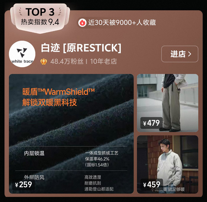TOP3:白迹 [原 RESTICK] —— 黑科技功能性玩家,秋冬保暖赛道黑马