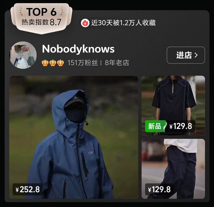 151 万的粉丝规模和 1.2 万 + 的月收藏量,证明了 Nobodyknows 对年轻消费者的吸引力:品牌跳出了传统山系的 “硬核” 标签,将机能元素与街头潮流结合,让山系服饰不再局限于户外场景,成功破圈进入日常穿搭赛道。
