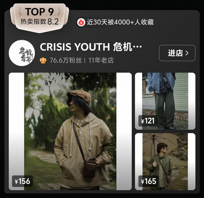 CRISIS YOUTH(危机青年)是榜单中价格最亲民的品牌之一,产品价格集中在 120 元 - 170 元区间,主打日系工装风山系服饰,版型宽松、设计简约,搭配做旧水洗工艺,还原了日式工装的松弛感。榜单中一款售价 156 元的卡其色连帽外套,搭配同色系工装裤,是典型的平价日系山系造型,深受学生党和入门级玩家的喜爱。