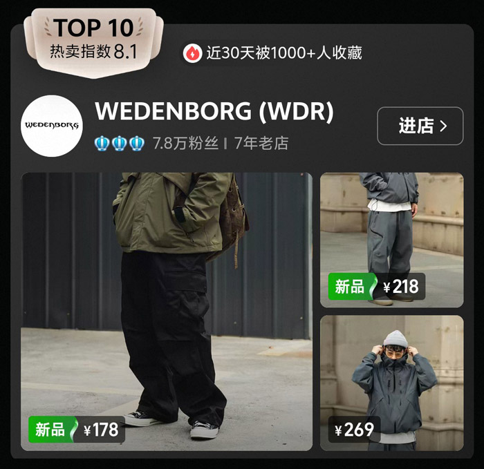 WEDENBORG(WDR)作为榜单末尾的品牌,主打 “基础款机能服饰”,价格集中在 178 元 - 269 元区间,产品以纯色外套、工装裤为主,设计上弱化了复杂的机能元素,更偏向日常百搭。榜单中一款售价 178 元的军绿色连帽外套,采用宽松版型和基础口袋设计,既能作为户外穿搭的基础款,也能搭配牛仔裤打造休闲造型。
