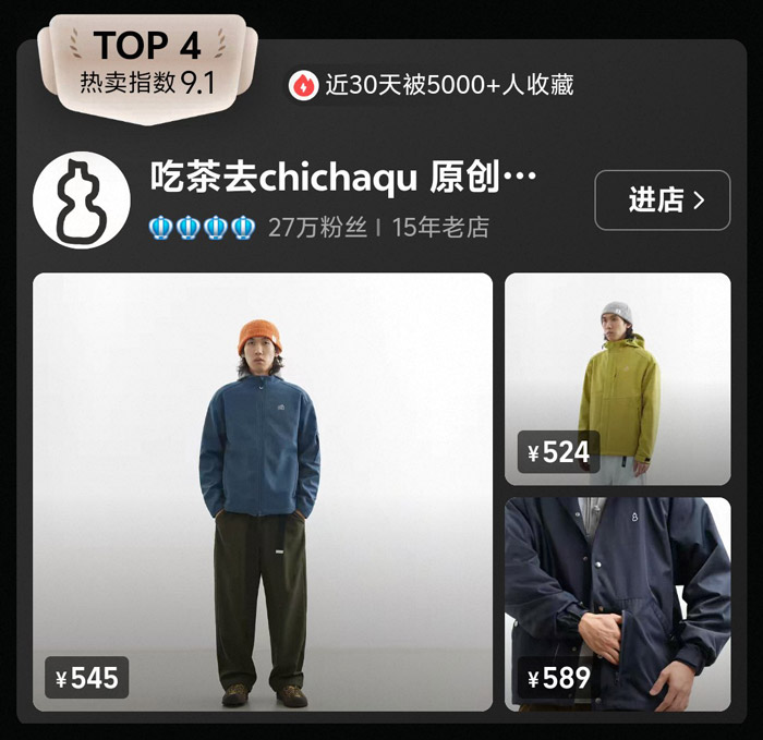 拥有 15 年历史的 “吃茶去 chichaqu”,是国内日系山系风格的 “OG 级” 店铺。品牌主打 “日系复古 + 户外机能” 的融合设计,产品价格集中在 545 元 - 589 元,风格偏向宽松工装版型,搭配做旧水洗工艺,还原了日式古着户外的松弛感。榜单中一款售价 545 元的藏青色连帽夹克,搭配军绿色工装裤,呈现出典型的日系山系造型,深受喜欢阿美咔叽、Cityboy 风格的消费者追捧。