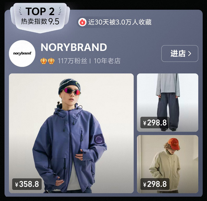 TOP2的 NICEBAD 热卖指数达9.6,近30天吸引9.0万人收藏,90.4万粉丝的体量背后,是品牌对美式复古松弛感的精准拿捏。榜单中,279 元的条纹毛领外套自带慵懒氛围,标注 “650 蓬 90 绒” 的 429 元羽绒服兼顾保暖与设计,还有 179 元的百搭休闲裤,覆盖了秋冬穿搭的核心场景。作为6年老店,NICEBAD 以舒适、百搭的美式风格为核心,用高性价比的单品收获了大量年轻消费者的青睐,也让 “松弛感穿搭” 成为品牌的鲜明标签。