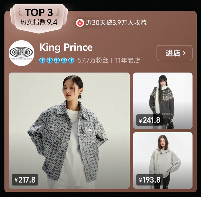 TOP3 的 King Prince 以 9.4 的热卖指数位列前三,这家拥有 57.7 万粉丝的 11 年老店,是榜单中资历较深的国潮品牌之一。从 217.8 元的小香风质感外套,到 241.8 元的复古提花毛衣,品牌主打轻复古通勤风,单品自带温柔的复古氛围,定价也多在 200 元左右,适配学生党与职场新人的日常穿搭。多年来,King Prince 以稳定的风格和亲民的价格,积累了一批忠实受众,成为轻复古国潮的代表品牌之一,也见证了国潮从萌芽到爆发的成长历程。