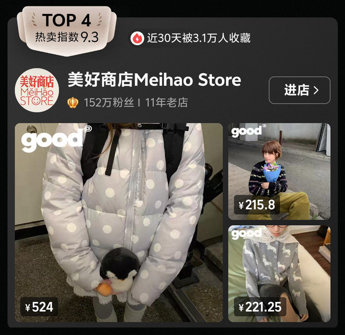 TOP4 的美好商店 Meihao Store 热卖指数 9.3,近 30 天 3.1 万人收藏,152 万粉丝的体量足以证明它的国民度。这家 11 年老店以童趣、复古的设计风格出圈,榜单中 524 元的波点羽绒服自带软萌氛围,200 元价位的印花上衣也充满创意细节。美好商店擅长将可爱元素与街头风结合,打造出 “治愈感” 满满的国潮单品,吸引了大量喜欢个性、软萌风格的年轻人,成为国潮赛道中独树一帜的存在。