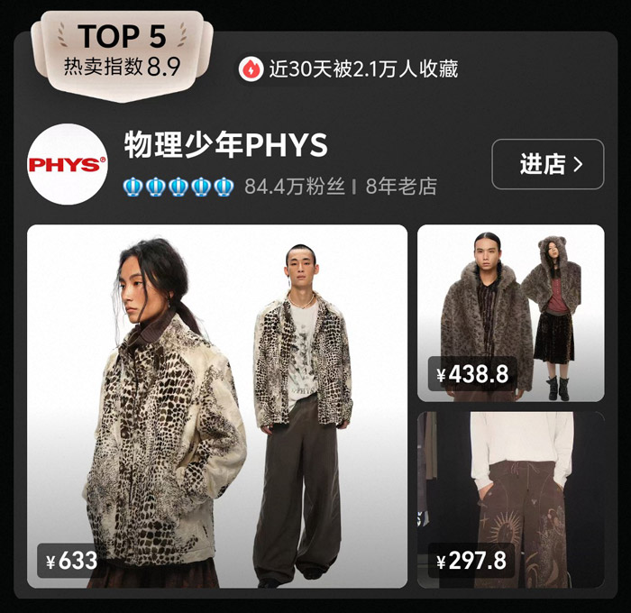 TOP5 的物理少年 PHYS 热卖指数8.9,近30天2.1万人收藏,84.4万粉丝的背后,是品牌对亚文化风格的大胆探索。榜单中,633 元的豹纹外套自带强烈的视觉冲击,印花休闲裤也充满街头叛逆感,单品定价虽偏高,但设计的先锋性和独特性,精准击中了喜欢小众、亚文化穿搭的年轻人。作为 8 年老店,物理少年始终坚持用大胆的元素和剪裁,打造具有辨识度的国潮单品,成为亚文化国潮的代表品牌,也让小众风格在主流市场中找到了一席之地。