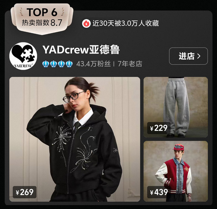 TOP6 的 YADcrew 亚德鲁热卖指数8.7,近30天3.0万人收藏,43.4万粉丝的 7 年老店,主打美式街头风,擅长用细节设计打造记忆点。榜单中,269元的刺绣连帽外套以烟花刺绣为亮点,红白色棒球服也充满复古美式氛围,休闲裤则以宽松版型适配街头穿搭。YADcrew 注重工艺细节,刺绣、撞色等设计让单品兼具个性与实穿性,成为美式街头爱好者的热门选择,也让 “细节控” 年轻人找到了穿搭共鸣。