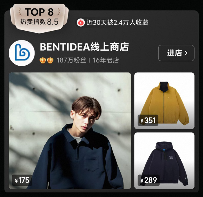 TOP8 的 BENTIDEA 线上商店热卖指数 8.5,近 30 天 2.4 万人收藏,187 万粉丝的 16 年老店,是榜单中资历最老的店铺之一。品牌主打日系工装、简约风,榜单中 175 元的深蓝色工装外套、289 元的连帽衫,都以简约的剪裁和百搭的配色为亮点,适合喜欢基础款又想穿出质感的消费者。深耕国潮赛道 16 年,BENTIDEA 以稳定的品控和简约美学,成为日系工装爱好者的 “常青树” 选择,也见证了国潮从 “符号化” 到 “质感化” 的转变。