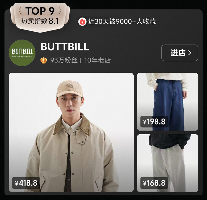 TOP9的BUTTBILL热卖指数8.1,近30天9000+ 人收藏,73万粉丝的10年老店,主打山系户外工装风,契合当下户外穿搭的热潮。榜单中,418.8元的卡其色工装外套自带户外氛围,休闲裤也偏向宽松实用的版型,设计兼顾了功能性与街头感。BUTTBILL 瞄准山系穿搭赛道,为喜欢户外、工装风格的年轻人提供了兼具实用性与潮流感的选择,也让 “山系国潮” 成为新的流行趋势。