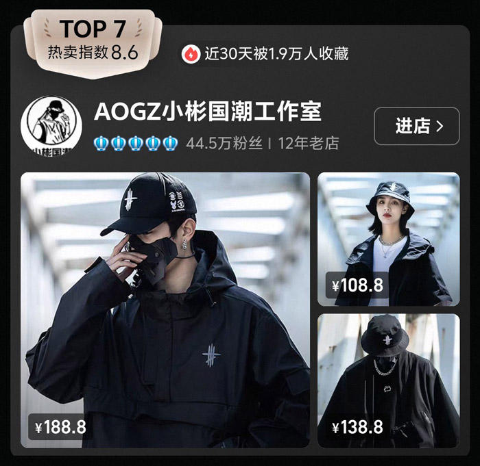 TOP7的 AOGZ 小彬国潮工作室热卖指数 8.6,近30天1.9万人收藏,44.5万粉丝的12年老店,是榜单中开店时间较长的工作室之一。品牌主打暗黑、机能、中性风,定价极具优势:188.8元的机能外套、百元左右的帽子,让学生党也能轻松 get 酷感穿搭。多年来,AOGZ 以高性价比的国潮单品为核心,主打百搭又有设计感的暗黑风格,收获了大量预算有限的年轻消费者,也让 “平价国潮” 成为品牌的鲜明标签。