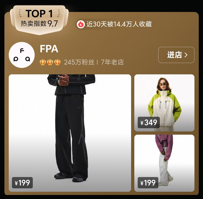 位列 TOP1 的 FPA 以9.7的热卖指数、近30天 14.4万人收藏的成绩断层领先,这家拥有245万粉丝的7年老店,早已是国潮赛道的头部品牌。从榜单展示的单品来看,FPA 主打年轻街头风,无论是利落的黑色休闲套装,还是撞色设计的休闲上衣,都兼顾了设计感与实穿性;百元级(199元、349元)的定价更贴合学生党消费能力,也让它成为国潮入门的热门选择。多年的口碑积累加上稳定的品控,让 FPA 在竞争激烈的国潮市场中始终保持高人气,成为本次榜单中毫无争议的 “人气王”。