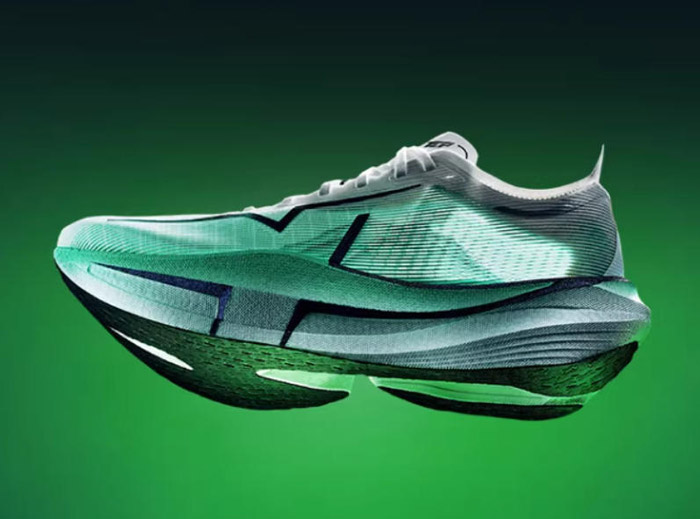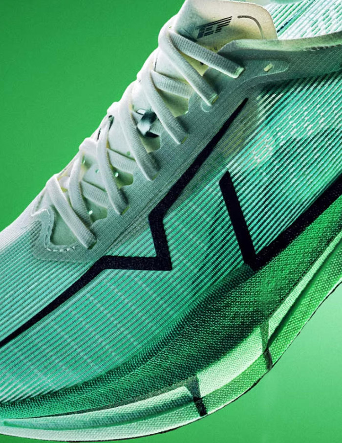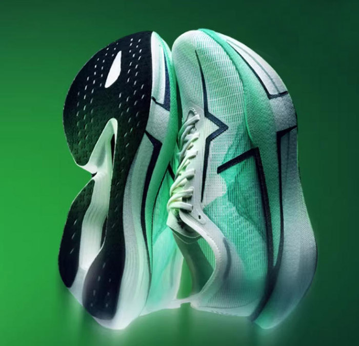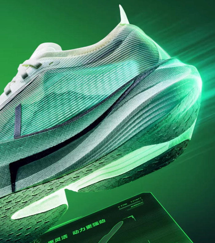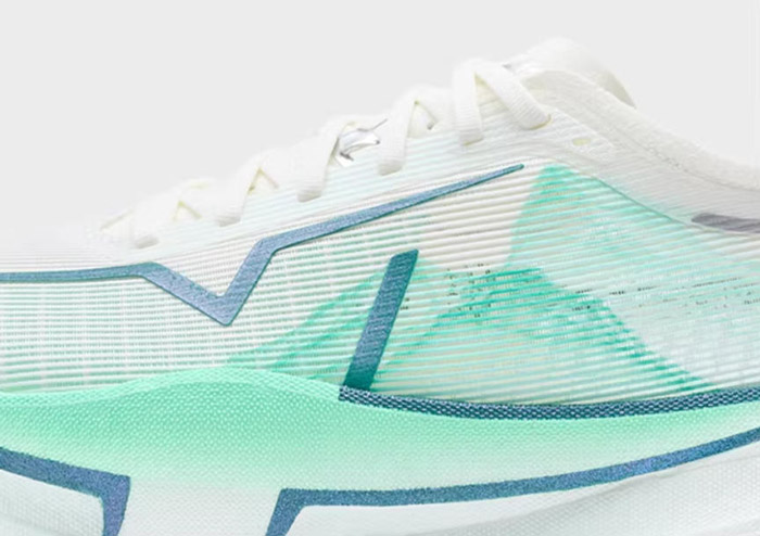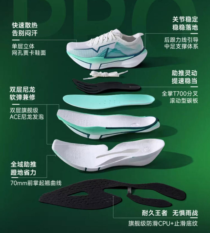 核心结构由上至下 / 由内至外为:爆米花发泡鞋垫→单层透孔贾卡鞋面→双层 ACE 尼龙发泡中底→全掌 T700 分叉滚动碳板→全掌分区 CPU+AI 底纹大底;辅以中足强化支撑、后跟不对称稳定结构、竞速鞋舌、弹力舌翼、后跟提带、反光组件等细节设计。