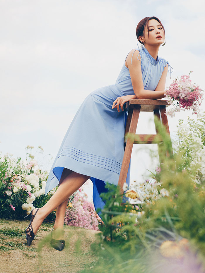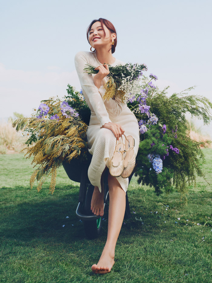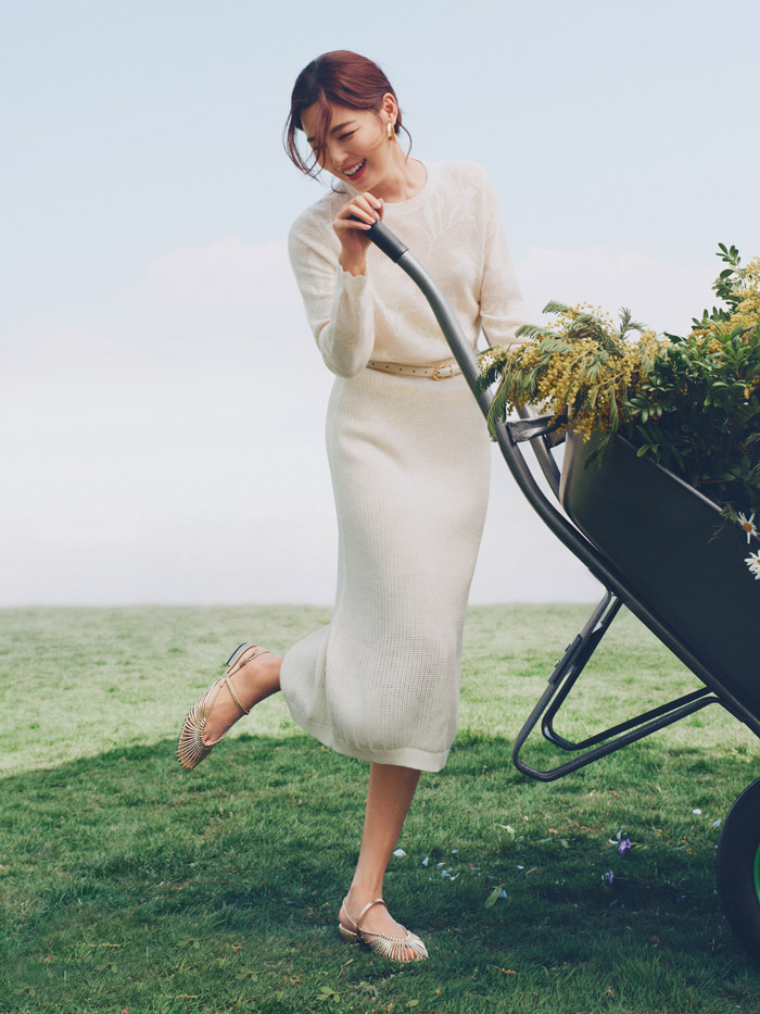 本次释出的主题广告大片,以春日旷野为核心场景,将鲜妍绣球花、灵动细碎花草等自然意象,与复古单车、原木座椅等质感道具相融,构筑出充满生命力与松弛感的视觉场域。辛芷蕾身着品牌春夏新品鞋履,在多元场景中切换自如,成为整组大片的视觉核心。她或赤脚闲坐花团旁,手持精致鞋履展露松弛笑意;或身着浅杏色针织套装,脚踩德训风单品倚靠载满花束的单车,尽显随性飒爽;亦或身着淡蓝色缎面连衣裙,搭配几何镂空尖头鞋斜倚花园长椅,演绎优雅与灵动的完美融合。对于当下都市女性而言,日常穿搭长期面临精致鞋履欠舒适、舒适款型缺质感的核心痛点,73Hours 此番视觉创作,既以自然美学呼应女性对松弛状态的追求,也通过鞋履实景呈现,精准回应女性在通勤、休闲、轻社交等多元场景中,对时尚感与穿着体验的双重需求。