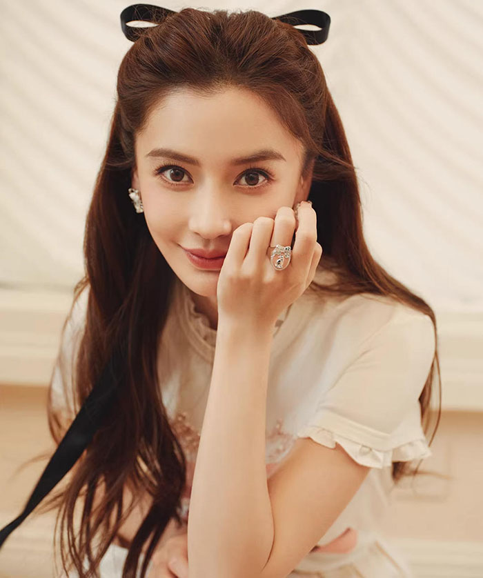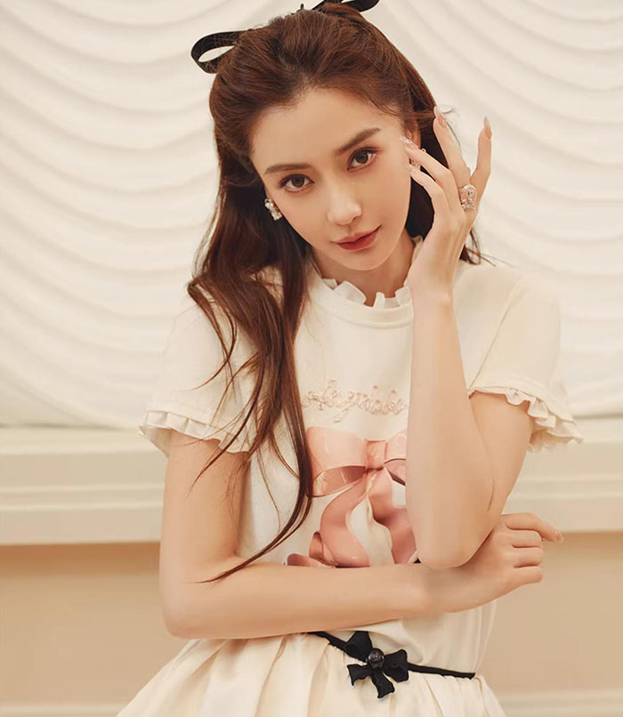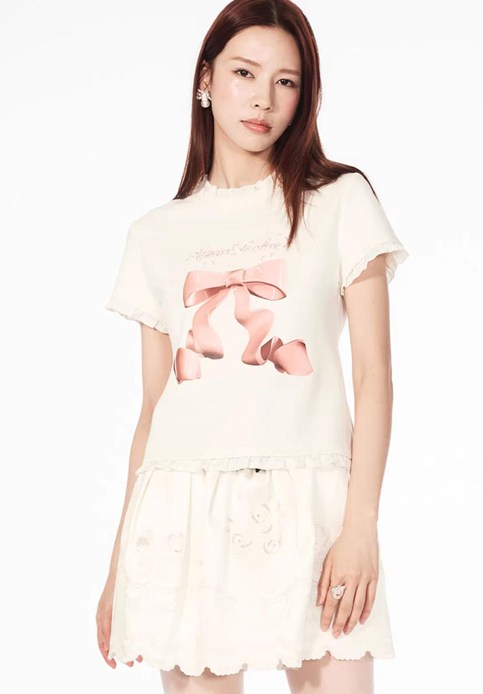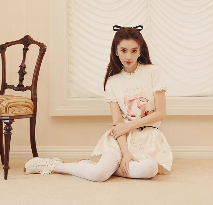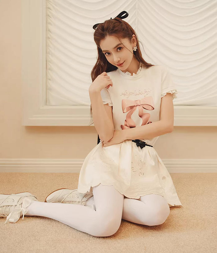 在品牌释出的广告大片中,杨颖将这款 T 恤的美学魅力展现得淋漓尽致。她以半扎马尾搭配黑色蝴蝶结发饰,与衣身的粉色蝴蝶结形成巧妙的色彩与元素呼应,让整体造型在细节处达成和谐;身着这款白 T,搭配同系列白色刺绣半裙、简约白色连裤袜与经典小白鞋,整套造型以纯净的白色为主调,仅以粉色蝴蝶结作为点睛之笔,完美诠释了 “芭蕾风千金” 的穿搭氛围 —— 既有少女独有的灵动娇俏,又不失海派法式风格与生俱来的优雅贵气。席地而坐时的松弛自在,托腮浅笑时的温柔缱绻,杨颖用不同的姿态告诉我们,这件 T 恤的魅力,在于它能完美平衡日常感与仪式感:它可以是约会时奔赴浪漫的甜美战袍,用一抹粉色蝴蝶结点亮心动瞬间;也能成为通勤路上的舒适选择,搭配牛仔裤、半身裙皆可,让都市女性在忙碌的生活中,也能轻松拥有精致的穿搭状态。