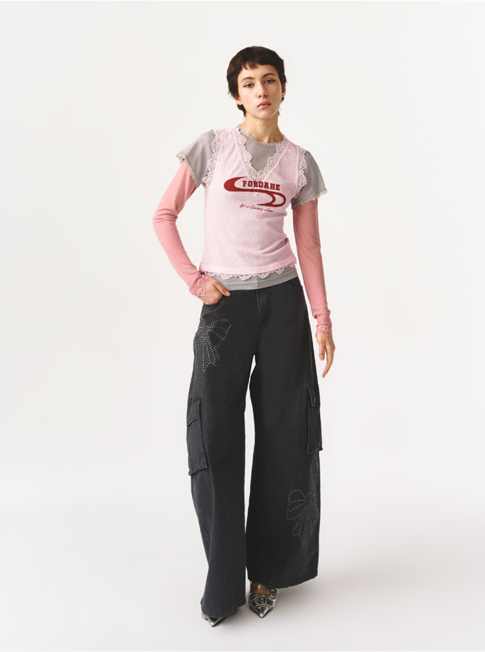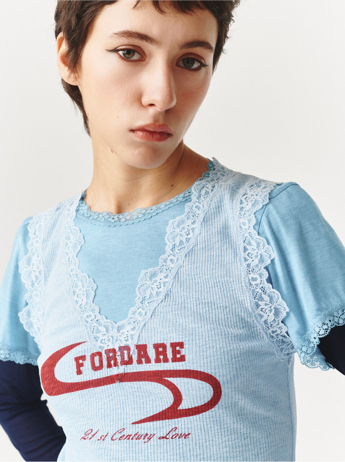 色彩与印花的设计则进一步深化了品牌基因:浅蓝款搭配沉稳藏青内搭,粉色款融合温柔灰粉撞色,强烈的色彩对比却达成奇妙的和谐统一;胸前 “FORDARE” 品牌标识与 “21st Century Love” 标语印花,以复古红色曲线勾勒出动感轮廓,既呼应了品牌 “复古未来主义” 的设计内核,更悄悄传递着 “21 世纪的爱,是多元、勇敢且充满自我表达” 的态度,让服装成为穿着者情绪与个性的延伸。