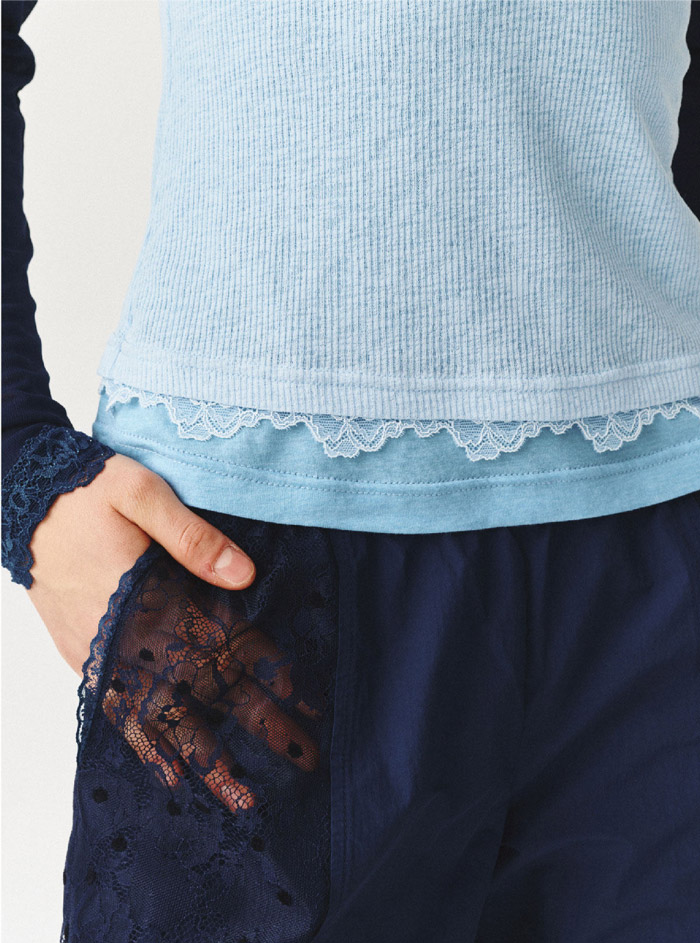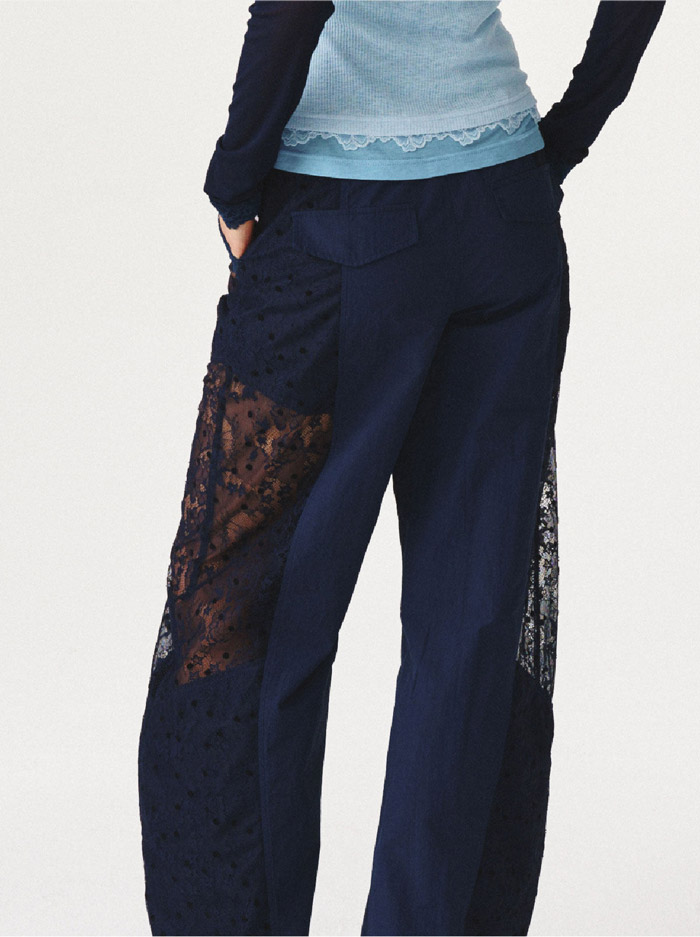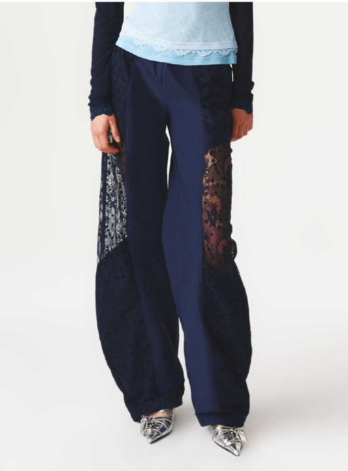 区别于传统运动裤的单一质感,这款单品在藏青色哑光面料的基础上,融入了多层次蕾丝拼接设计,瞬间成为视觉焦点:裤身侧面及口袋区域拼接的不同肌理藏青色蕾丝,透视感蕾丝与植绒提花蕾丝交错叠加,在深浅明暗的光影变化中营造出浓郁的复古氛围感;而口袋边缘的蕾丝镂空设计,更与上衣的蕾丝花边内搭形成巧妙呼应,让整体造型更具完整性,为休闲风格注入了恰到好处的精致甜美元素。这种 “运动裤的松弛骨架 + 蕾丝的柔美血肉” 的创新组合,精准击中了当下流行的 “复古松弛感” 穿搭趋势,既满足了日常出街的舒适需求,又能通过独特的蕾丝细节提升造型辨识度。