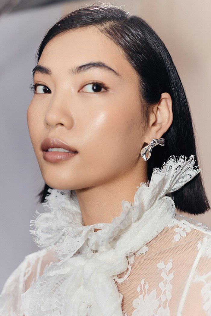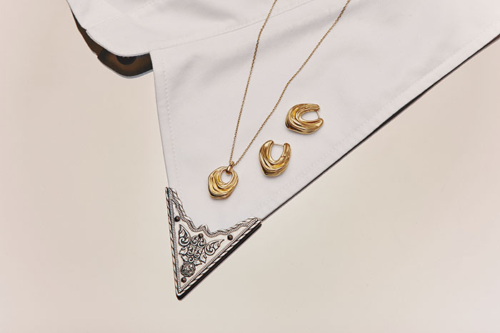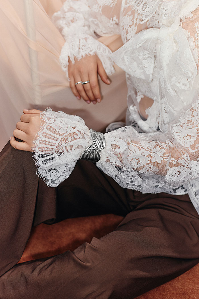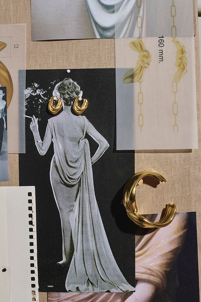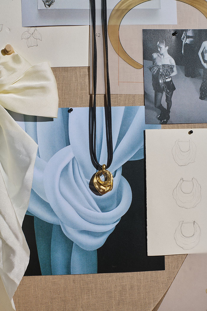 本次联名系列以draping立体剪裁为核心设计语言,精准提取 MARKGONG 时装中丝绸、织物在身体上流动、堆叠、悬垂的动态瞬间,借助金属的延展性与雕塑感完成时装美学的珠宝化转译。Missoma 经典的熔岩金属形态被焕新演绎,以更细腻的工艺呈现褶皱、垂坠、打结的肌理,让坚硬冰冷的金属呈现出织物般的轻盈、柔软与流动感,完美平衡硬朗结构与温润质感。
