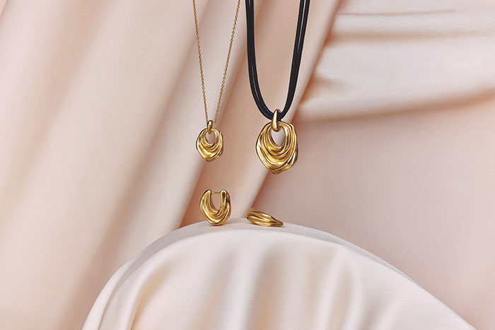 金色褶皱圆环吊坠项链、褶皱圆环皮绳项链,以流动褶皱勾勒丝绸般垂坠线条,哑光金属在颈间形成层次光影,大号圆环搭配双层皮绳,随性中自带格调;耳饰遵循 “正面克制、侧面惊喜” 逻辑,正面简约圆片,侧面暗藏立体折叠细节,低调却极具存在感,轻松适配日常通勤与轻职场造型。