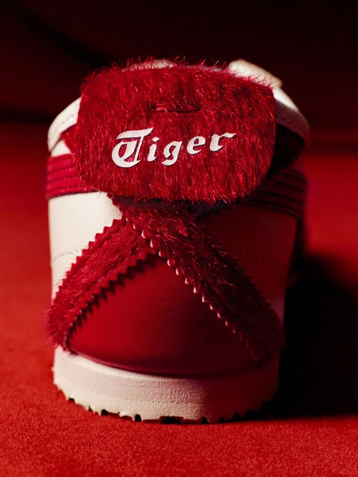 材质的碰撞让质感层次瞬间丰盈:鞋身主体采用瓷感细腻的光滑皮革,触感软润却不失挺括,支撑性与舒适度兼顾;鞋头与鞋舌拼接浅米色麂皮,绒感软糯得如同刚晒透阳光的羊绒,一刚一柔的面料碰撞,将复古腔调揉捻得恰到好处。最令人心动的莫过于鞋后跟那片蓬松细密的正红仿马毛饰片,宛如把新年绒花直接缀于鞋身,其上绣着的白色 “Tiger” 字样简洁利落,低头间便能捕捉到这份软乎乎的喜庆;标志性的虎爪纹也玩起新花样,渐变深红的皮质裁出流畅线条,顺着鞋身斜向铺展,既保留了品牌高辨识度,又添了中式纹样的婉转韵律,复古与创新在此完美交融。