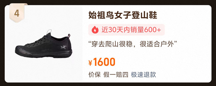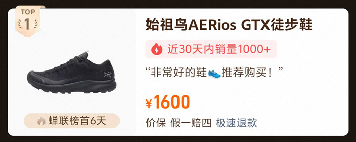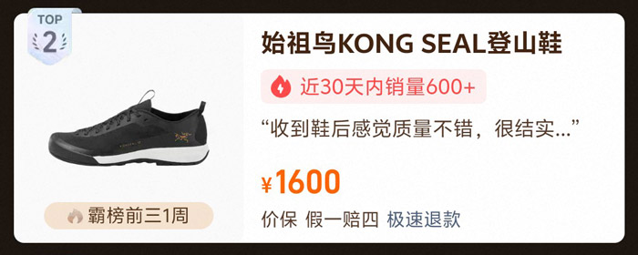 该款登山鞋参考售价1600元,稳居榜单前三长达1周,近30天销量600+,累计销量700+。专为高强度户外登山场景量身打造,采用轻量化耐用材质,搭配强化抓地设计与高效支撑结构,既能减轻足部负重,又能保障每一步行进的稳定性,让登山爱好者在攀爬过程中稳如泰山,有效缓解长途跋涉的足部疲劳。